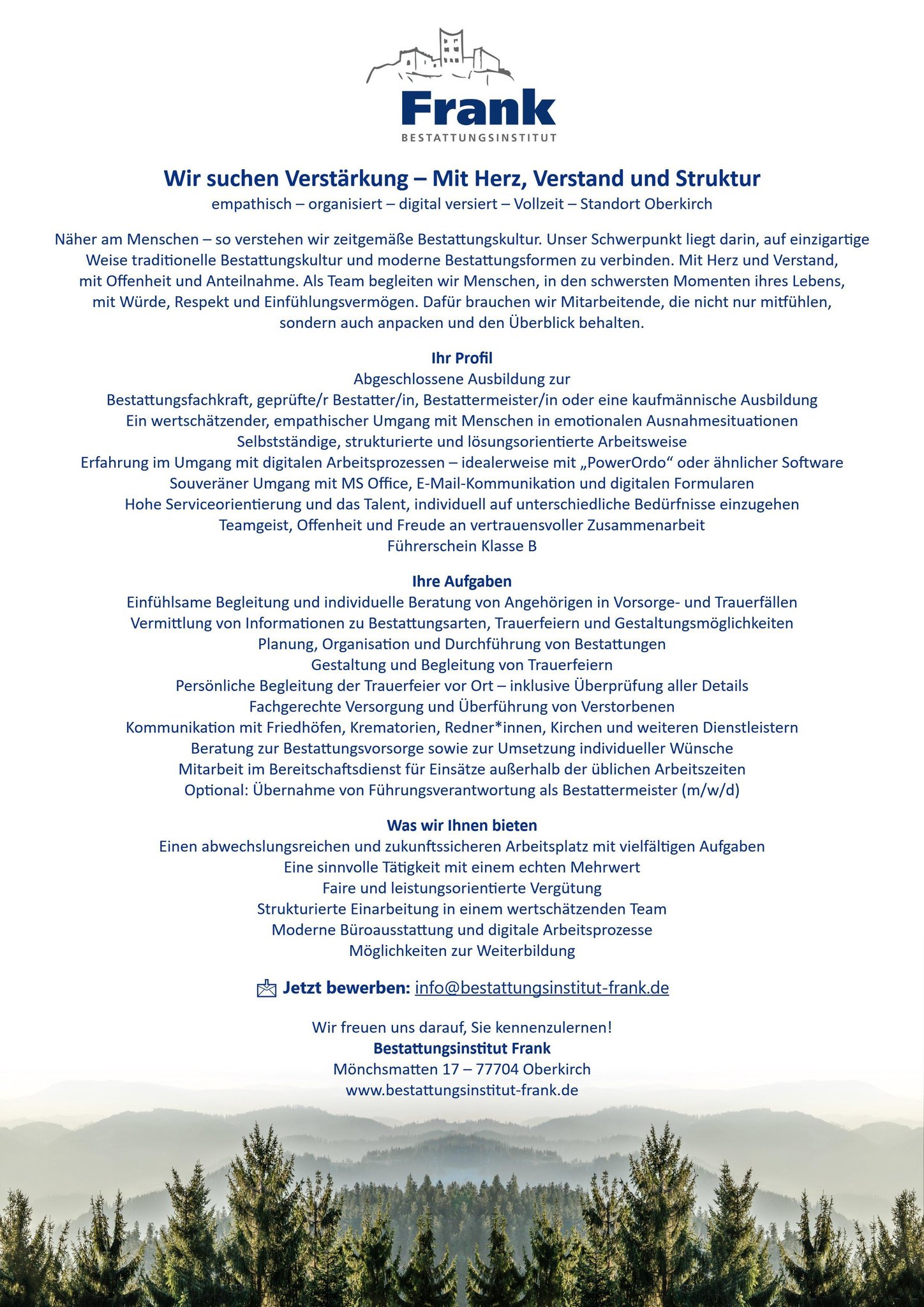 Wir suchen zum nächstmöglichen Zeitpunkt in Voll- oder Teilzeit Bestattungsfachkraft / geprüfter Bestatter / Bestattermeister oder gern auch motivierte Quereinsteiger (m/w/d) am Standort Oberkirch, in der sonnigen Ortenau, im Schwarzwald.
